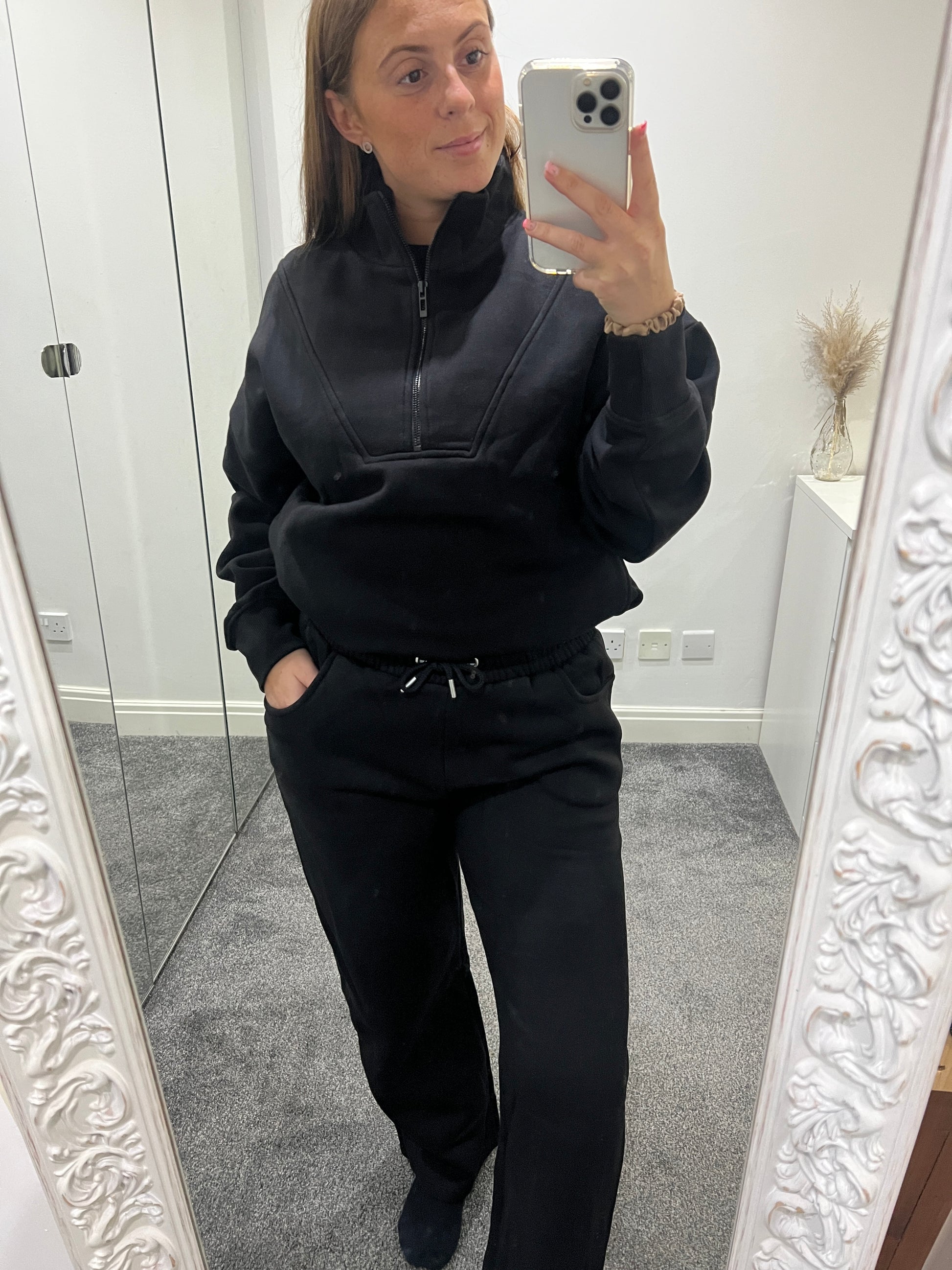 Black fleece lined wide leg joggers with a drawstring waist. The 1/2 zip jumper is also fleece lined. Both items have pockets.