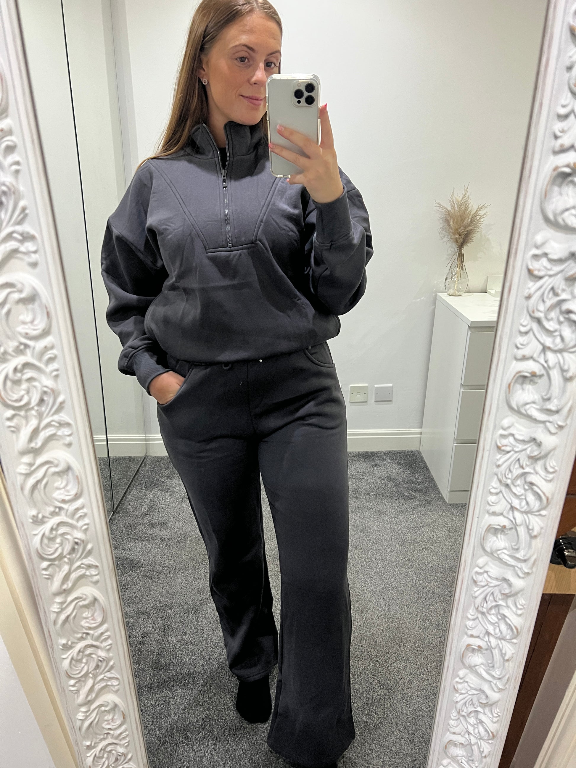 Dark grey fleece lined wide leg joggers with a drawstring waist. The 1/2 zip jumper is also fleece lined. Both items have pockets.