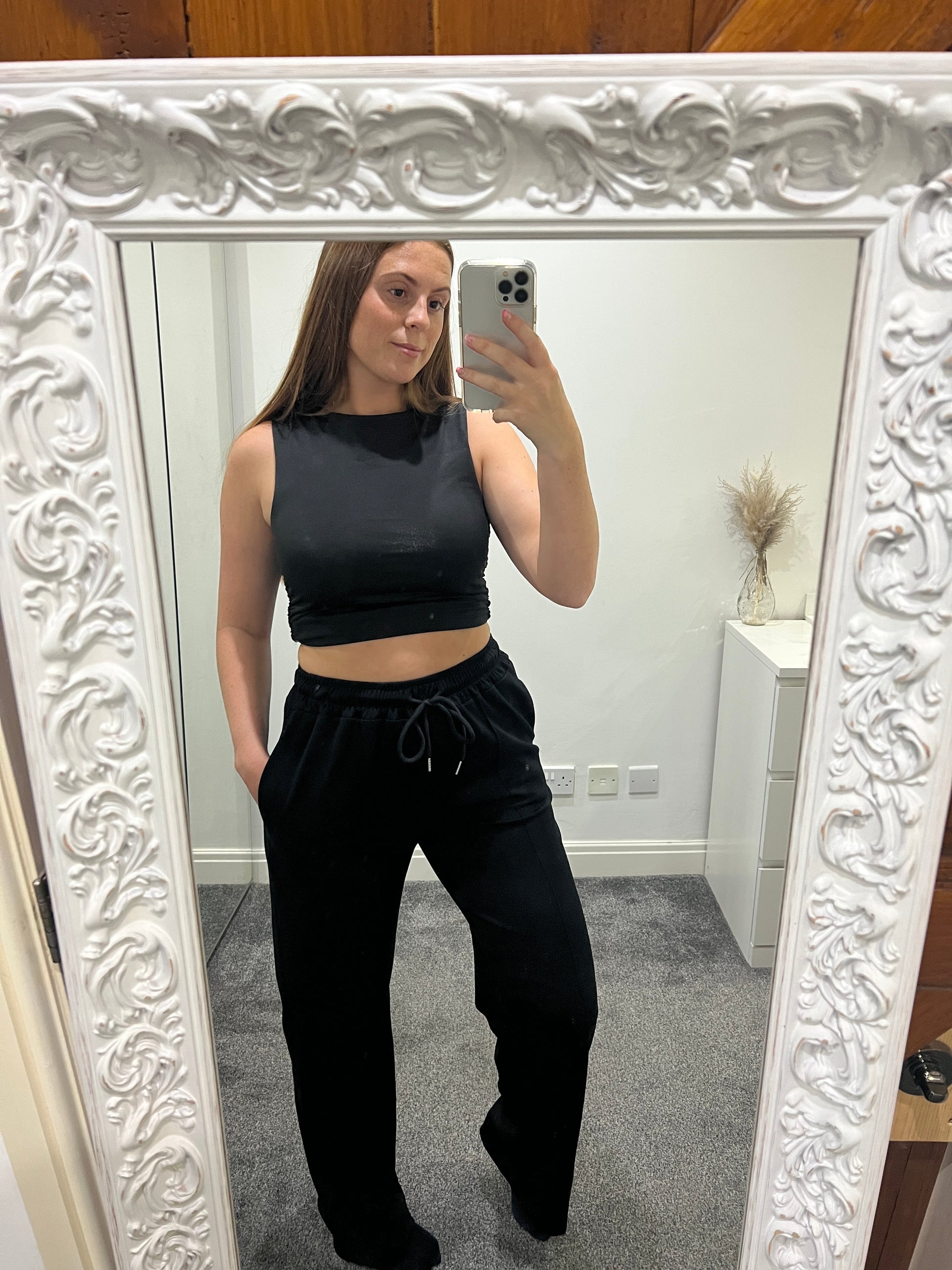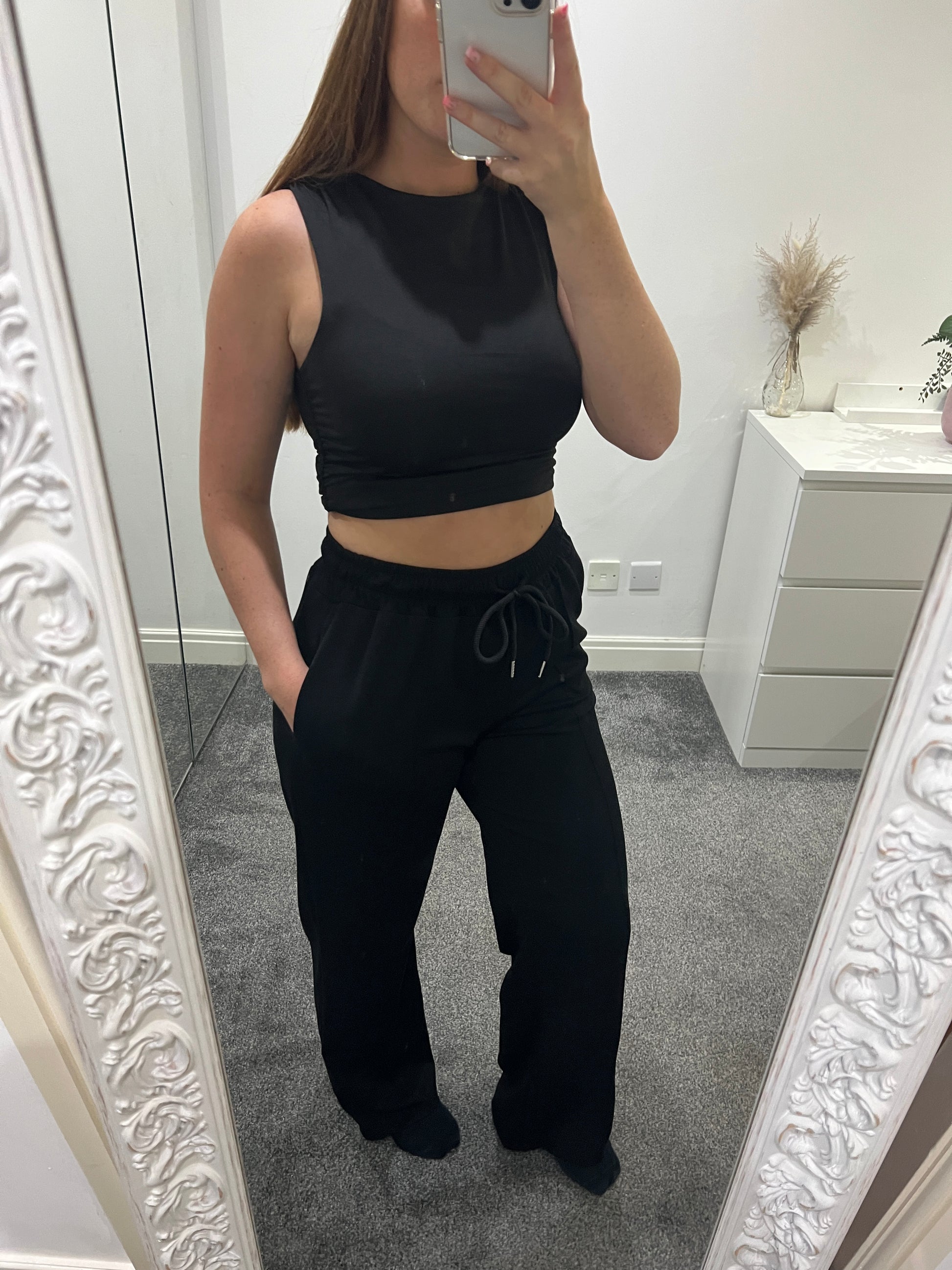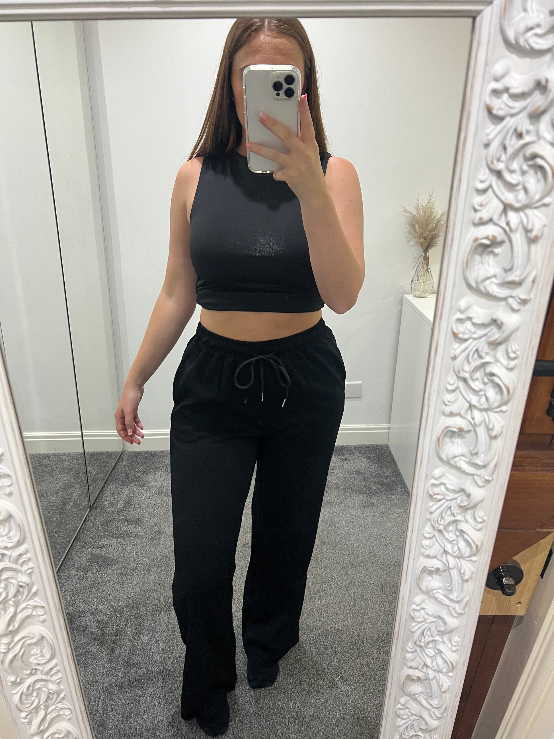 Black wide leg drawstring joggers with pipe detailing down the front.