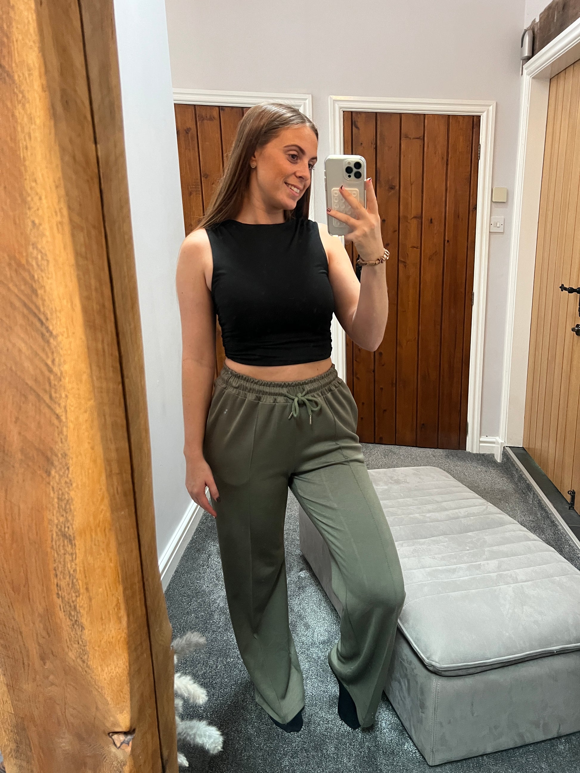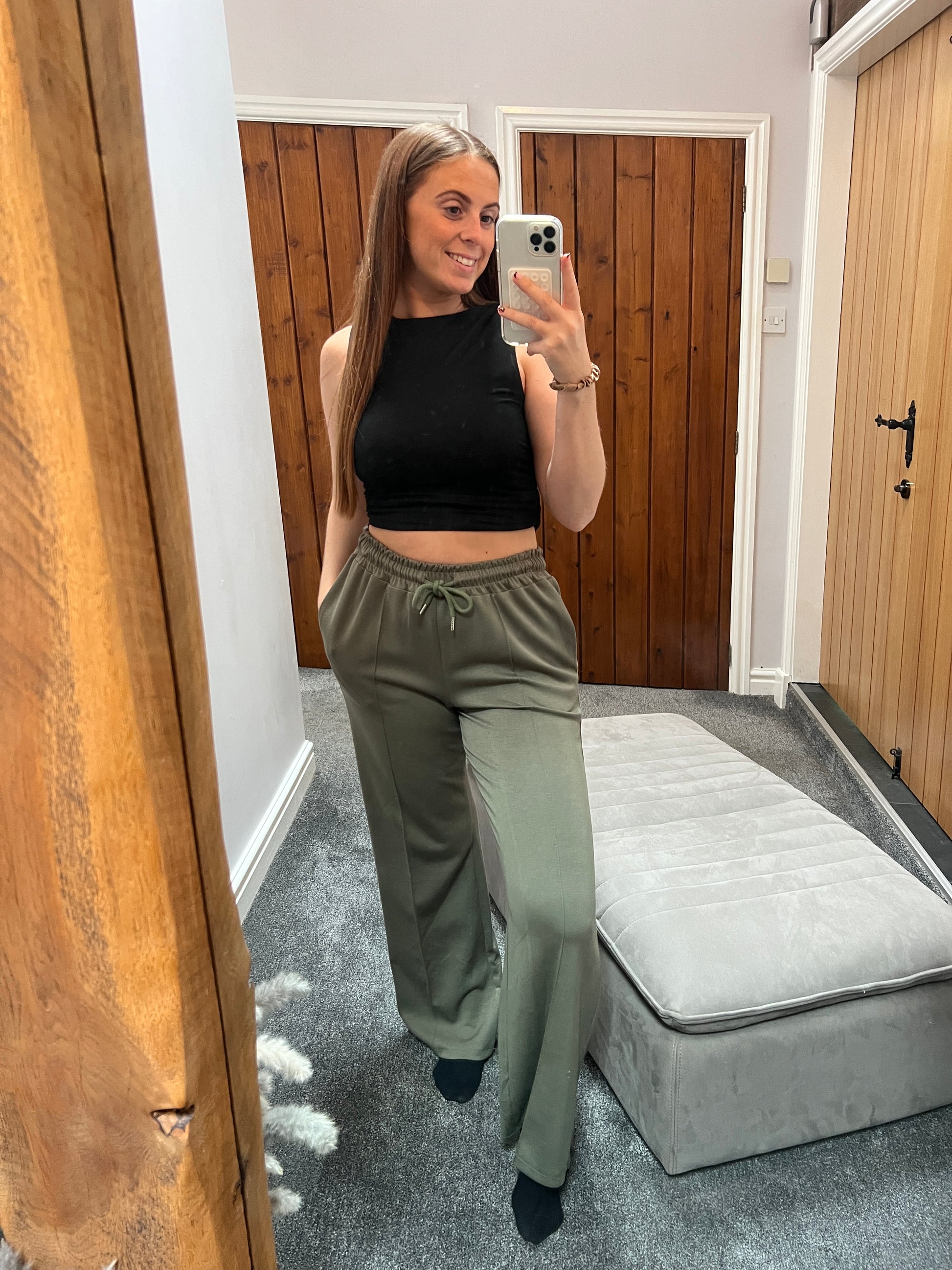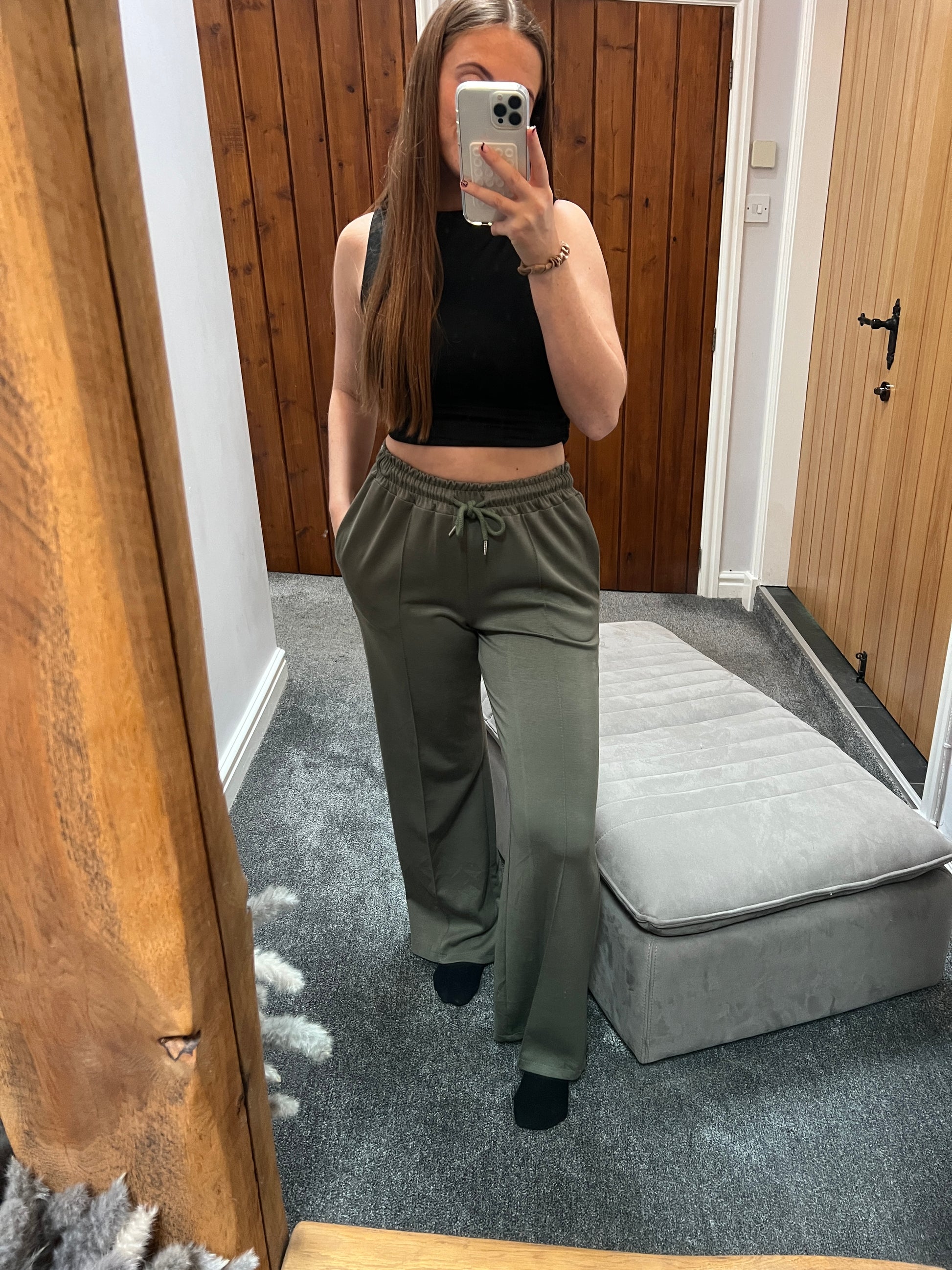 Khaki wide leg drawstring joggers with pipe detailing down the front.